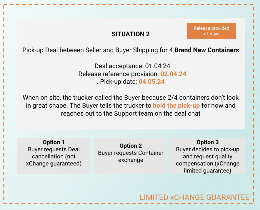 Picked-Up Guarantee: If the containers are picked up after 7 days from the provision of the release reference, by the Seller, the xChange guarantee will only be limited (after submission of evidence and validation by xChange).