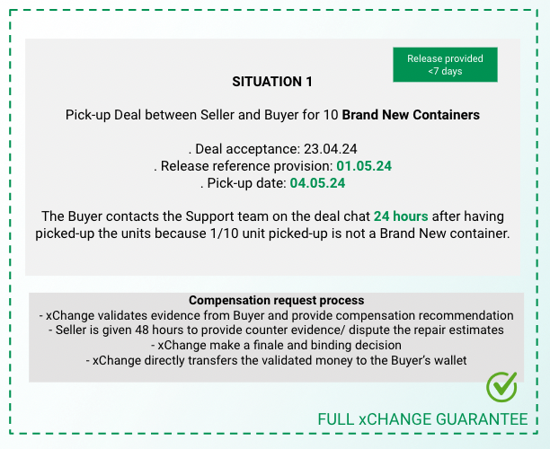 - if the containers were picked up within 7 days from the provision of the release reference by the Seller, the xChange guarantee will be full (the full amount of repair will be, after submission of evidence and validation by xChange, guaranteed).