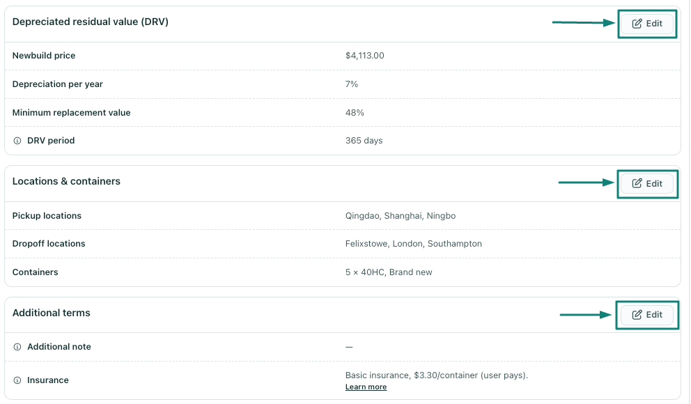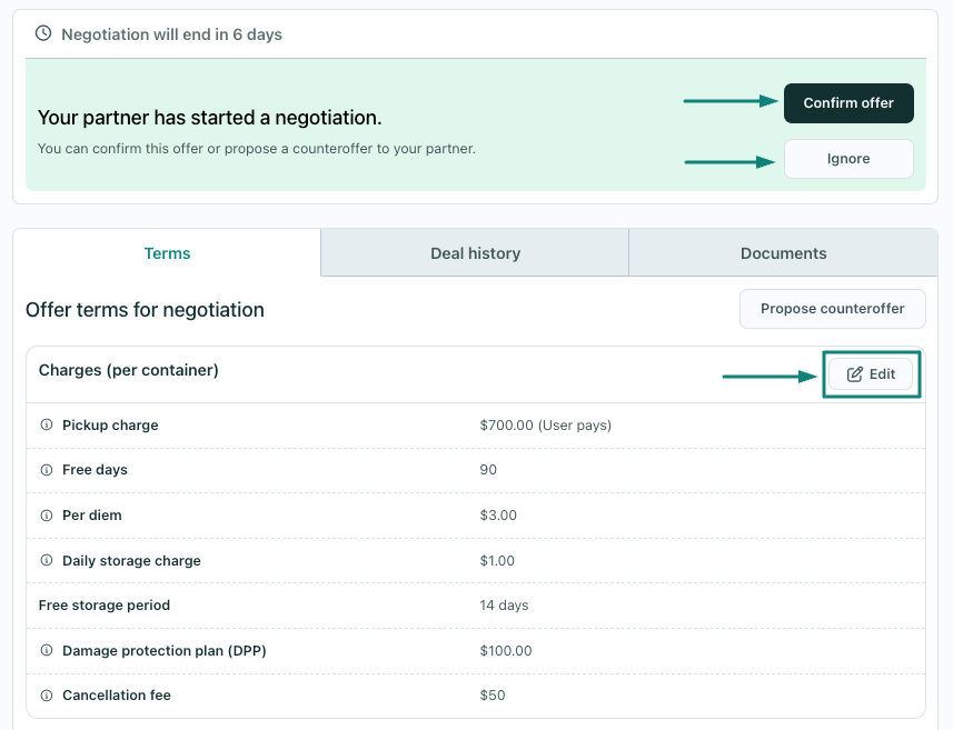 - In all of the stages of the leasing deal, users can directly change the terms through the ✏️ edit option.