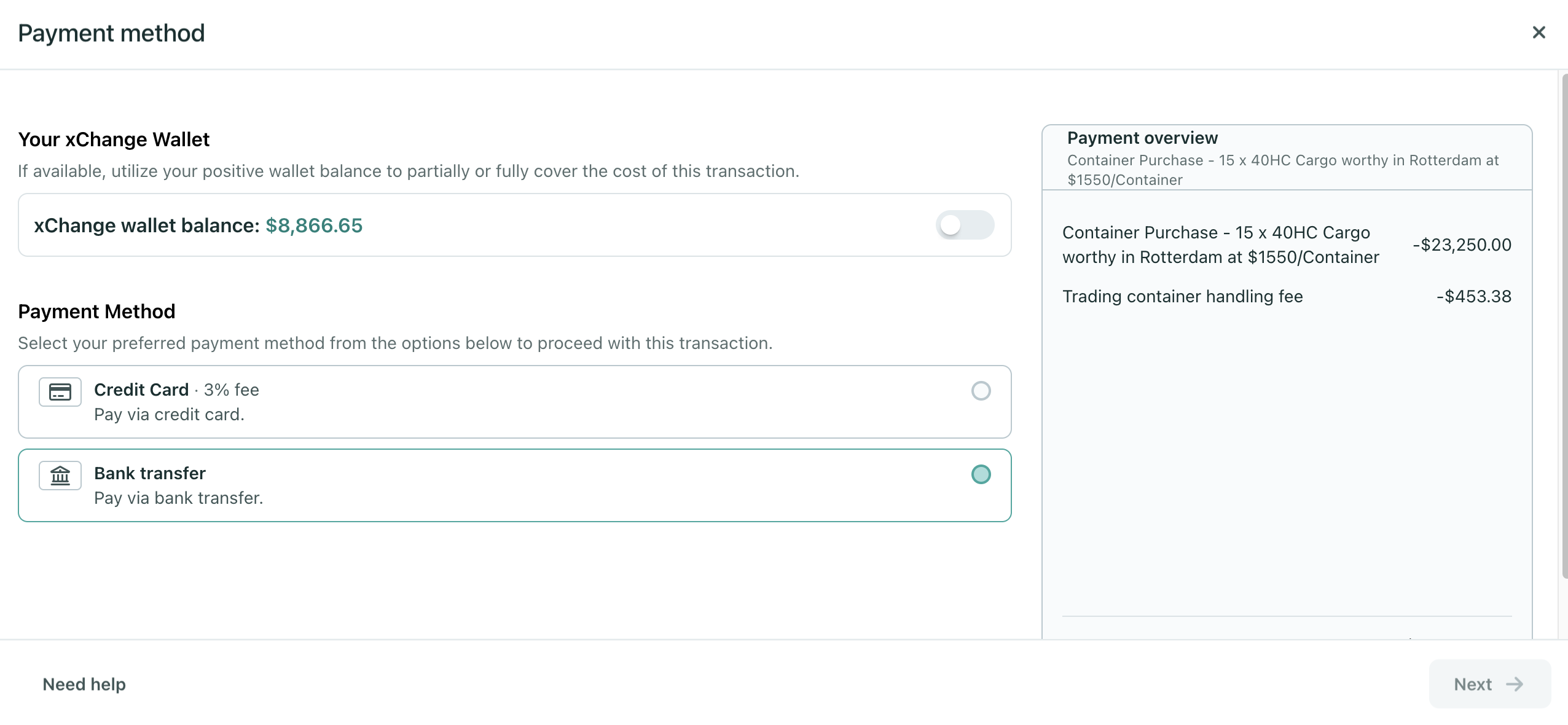 - If you selected the option of Bank transfer, you can review all of Container xChange's Bank details on the invoice or in the following article: