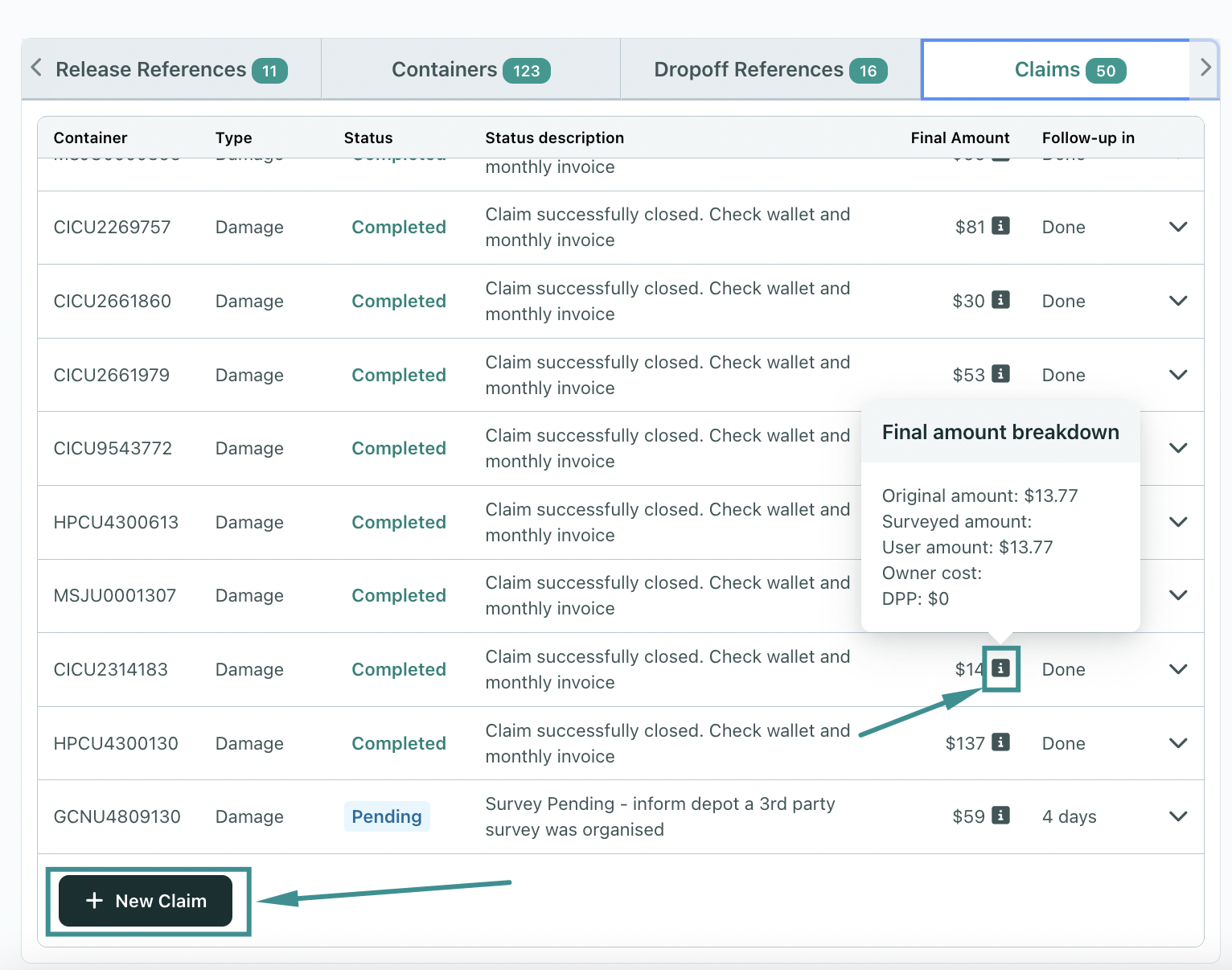 Once the damage or DRV claim has been approved and processed, both Suppliers and Users will be able to see it on the deal page, under the Claims tab: