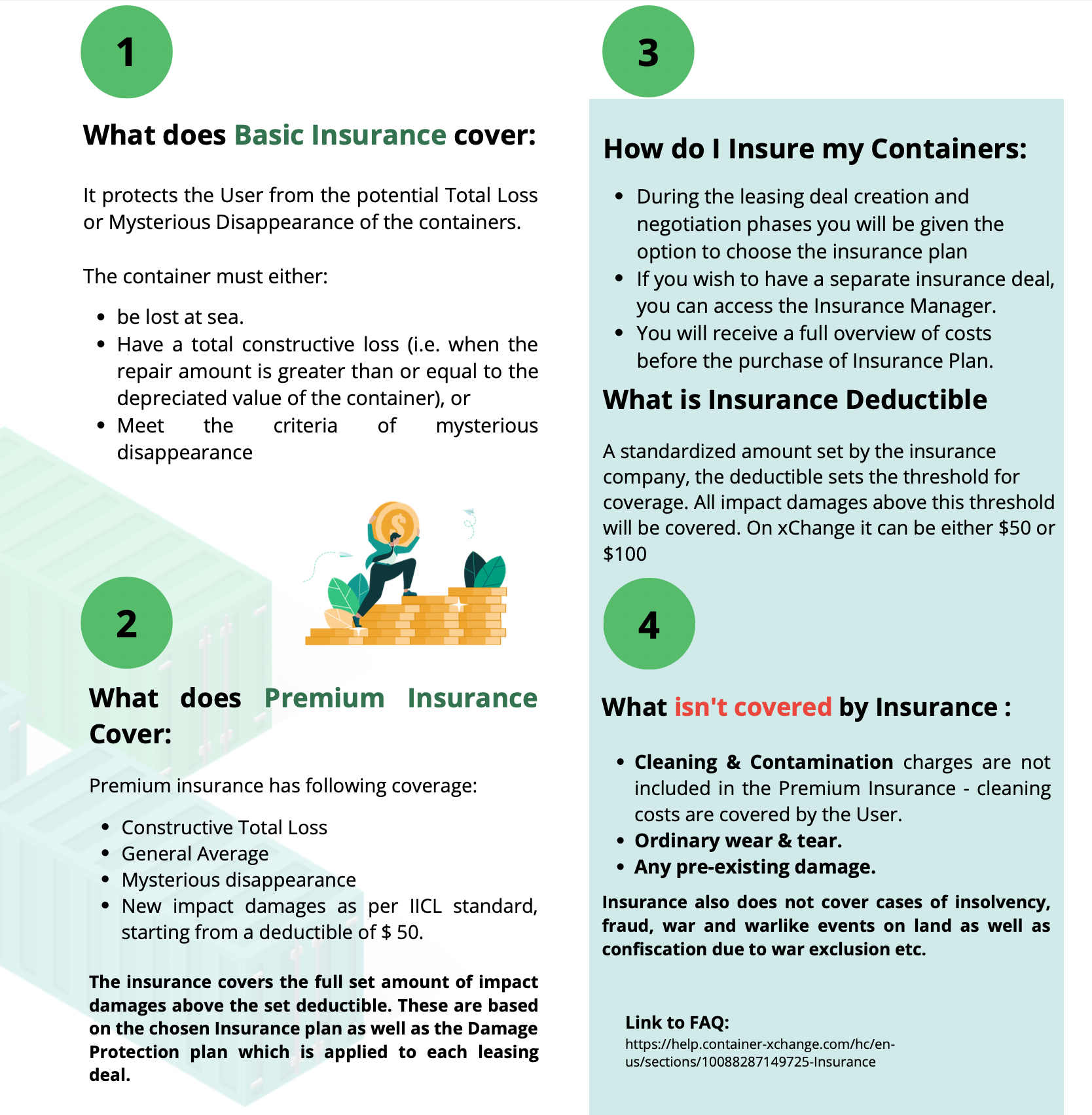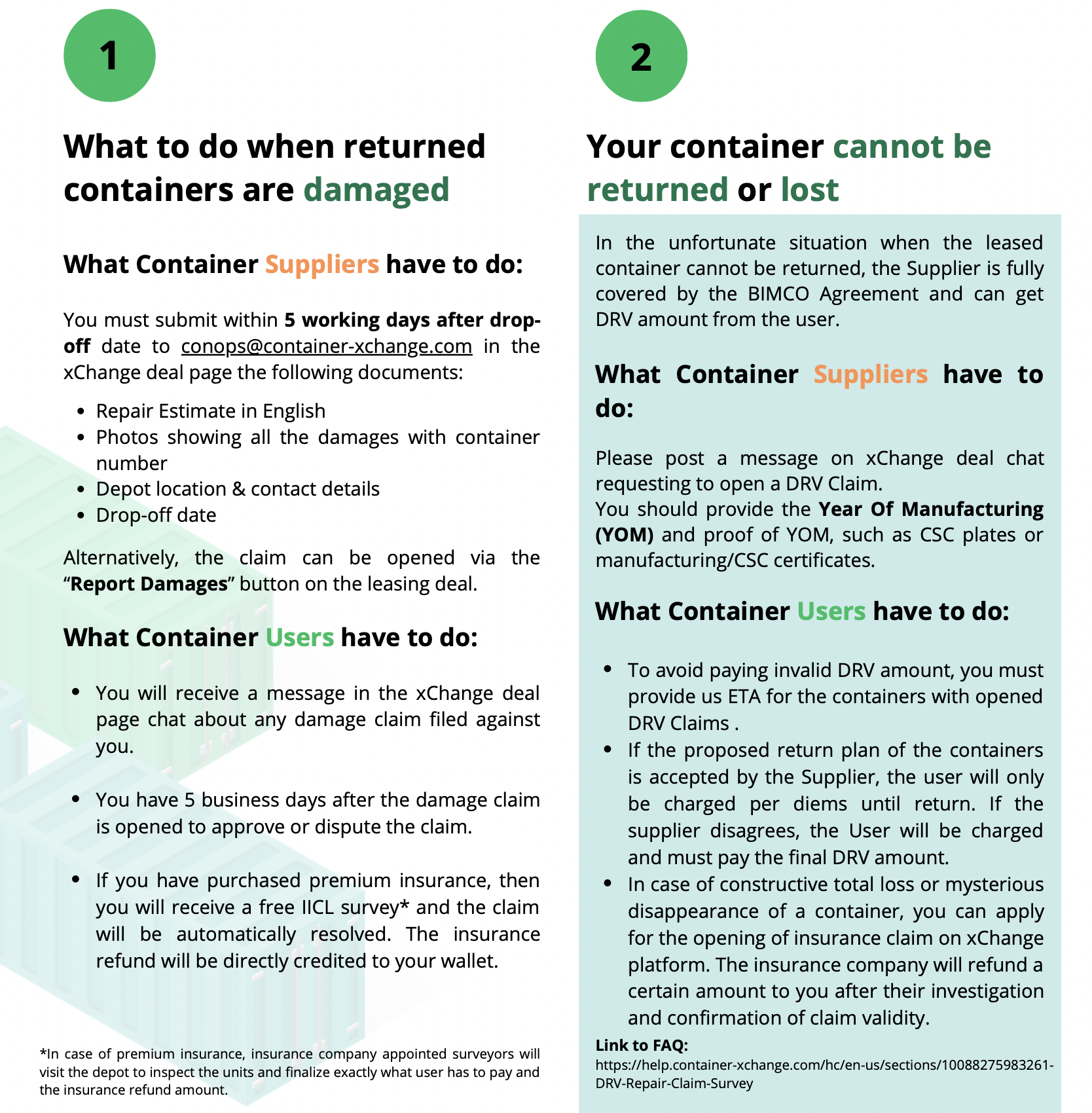 In the unfortunate event of container loss, the User of the containers has to reimburse the full Discounted Residual Value (DRV) to the Supplier. To secure themselves against the financial loss, the User can choose to use the Insurance plans offered by xChange.