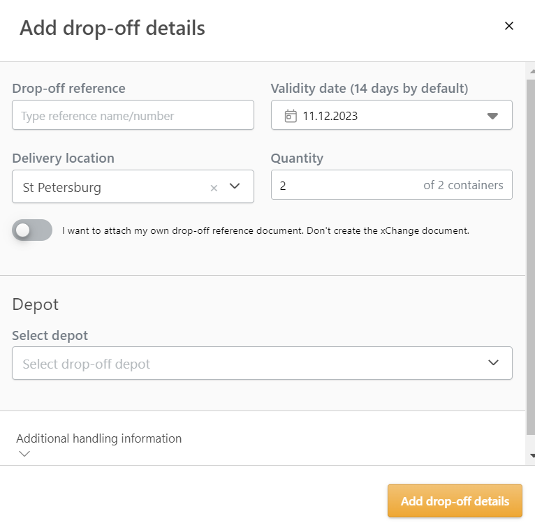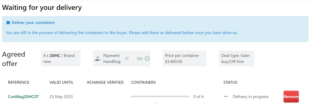 然后,卖方必须将每个集装箱的箱号和交货日期输入到平台上。一旦所有箱子都交付完毕,该订单将被标记为 "已完成"。