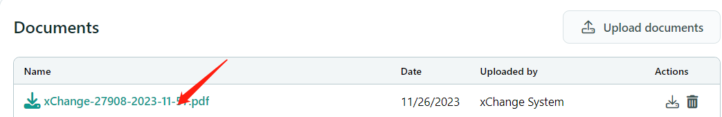 在付款阶段,系统将自动上传发票。如下图所示,发票将显示在 "文件区 "(Documents)。