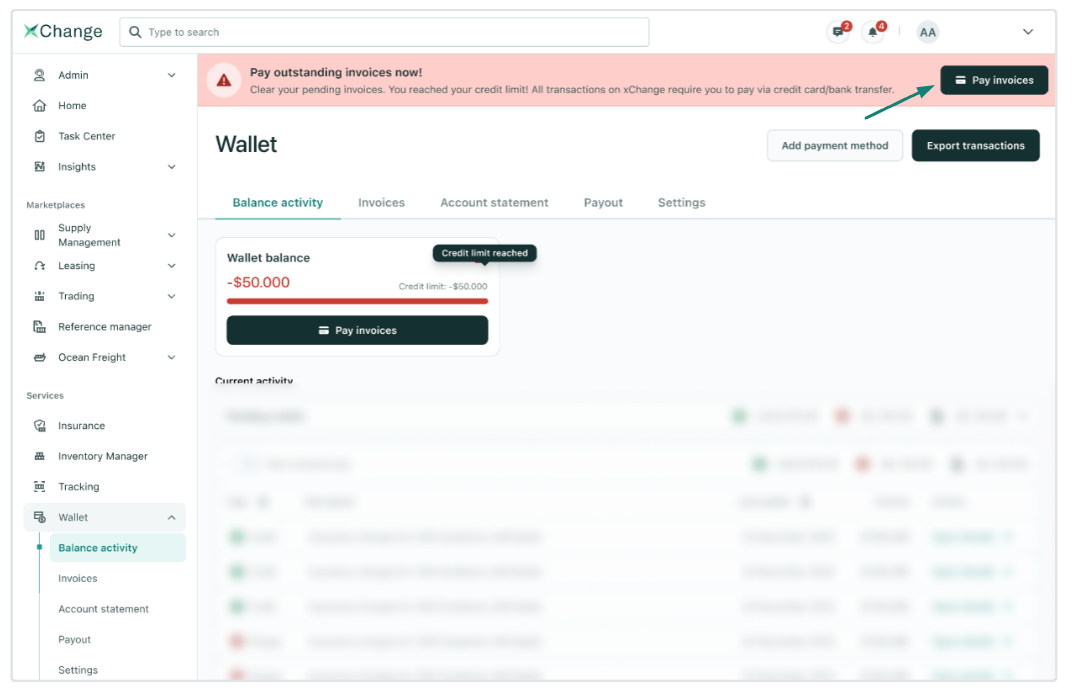 • 您可以点击 "支付发票 "(Pay invoices)按钮,支付款项,降低信用额度使用率。只要结清待付发票,您就可以更快地接受交易。