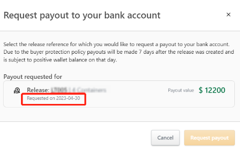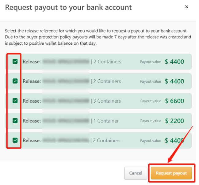 当您上传放箱单以后,您可以按订单上的‘申请提现’(Request payout)按钮,选择放箱单号和确认金额,然后按申请。